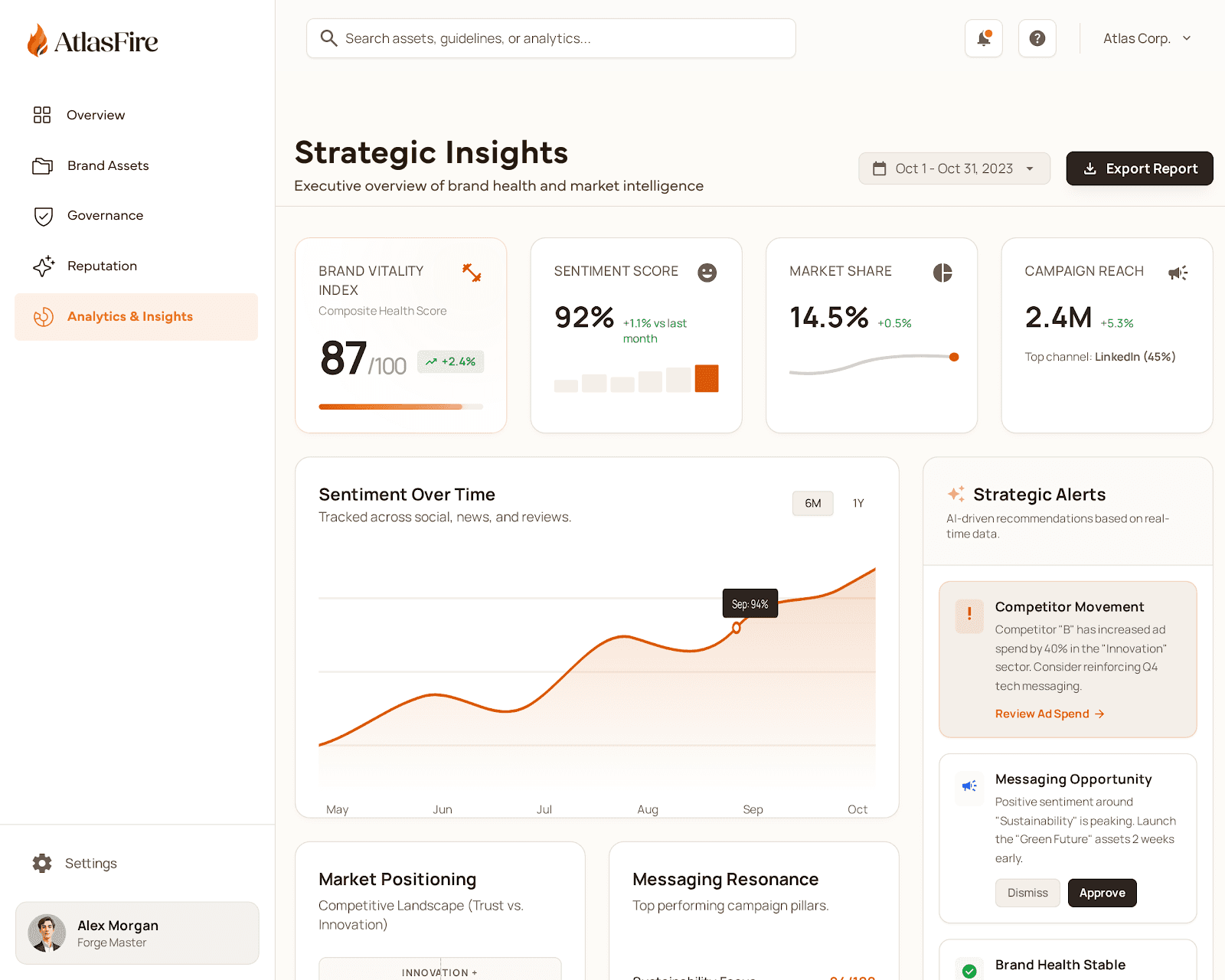 From design assets to review monitoring, the AtlasFire dashboard gives you a single space to manage your brand. Access your identity, track its performance, and collaborate with your team — all within a system designed for modern brand governance.